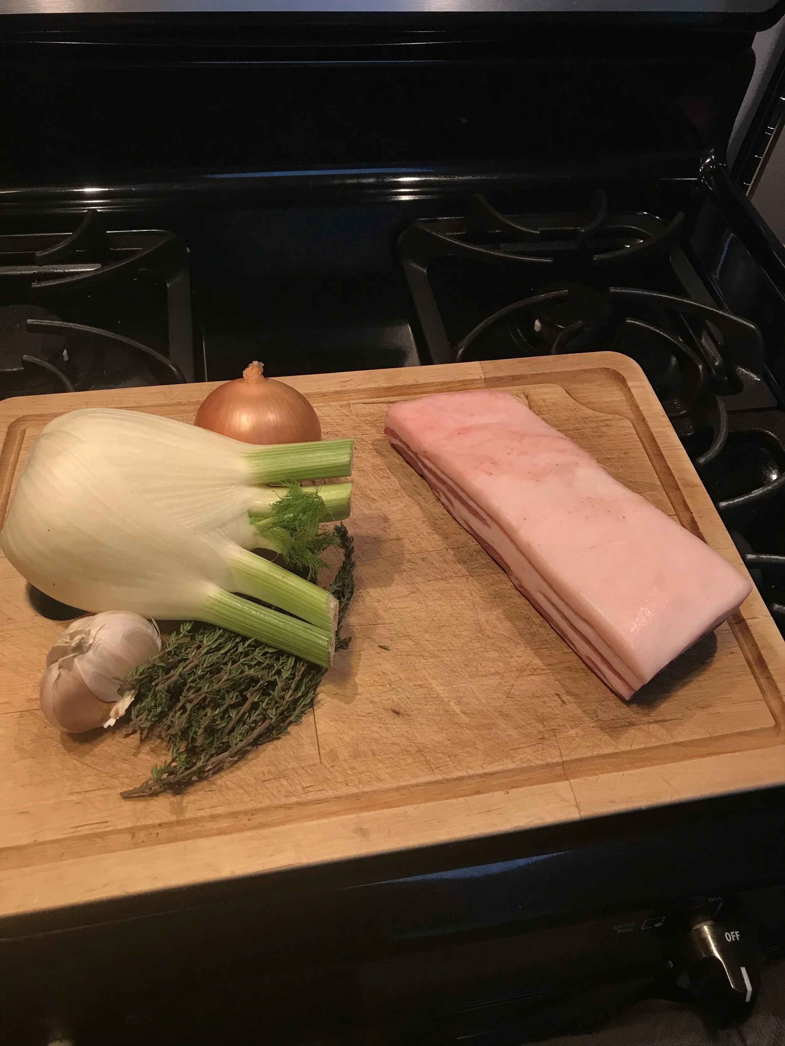 Our main ingredients: pork belly, fennel, onion, thyme, and garlic.